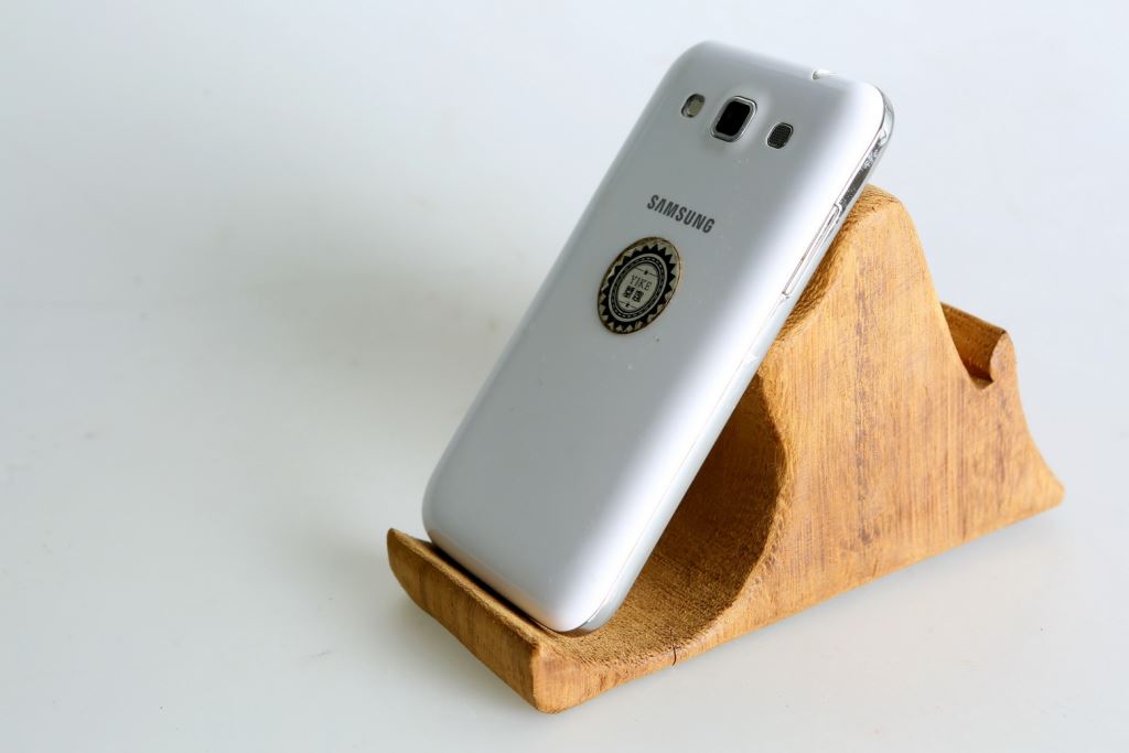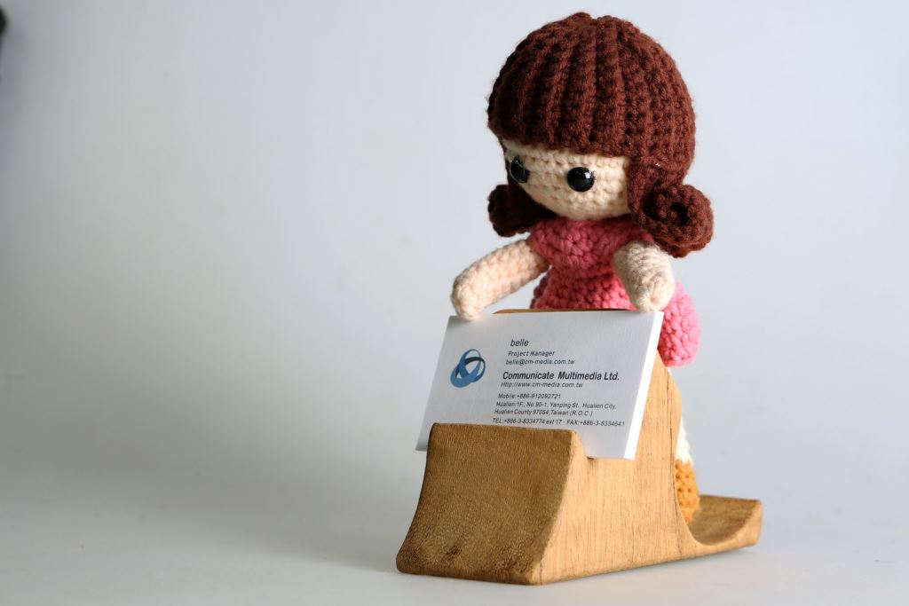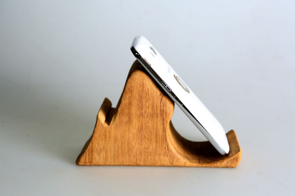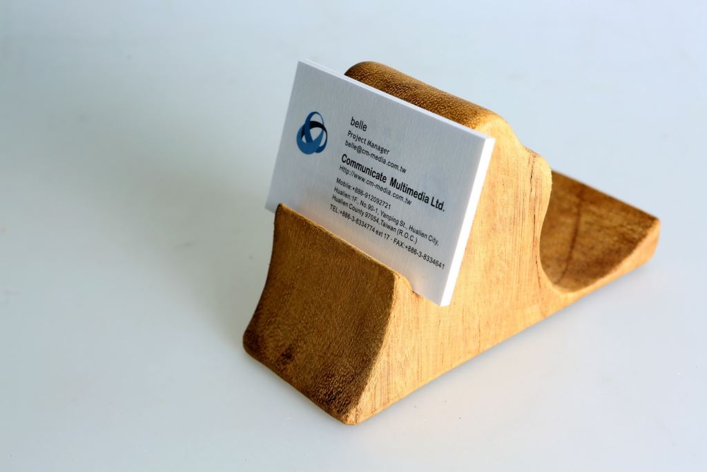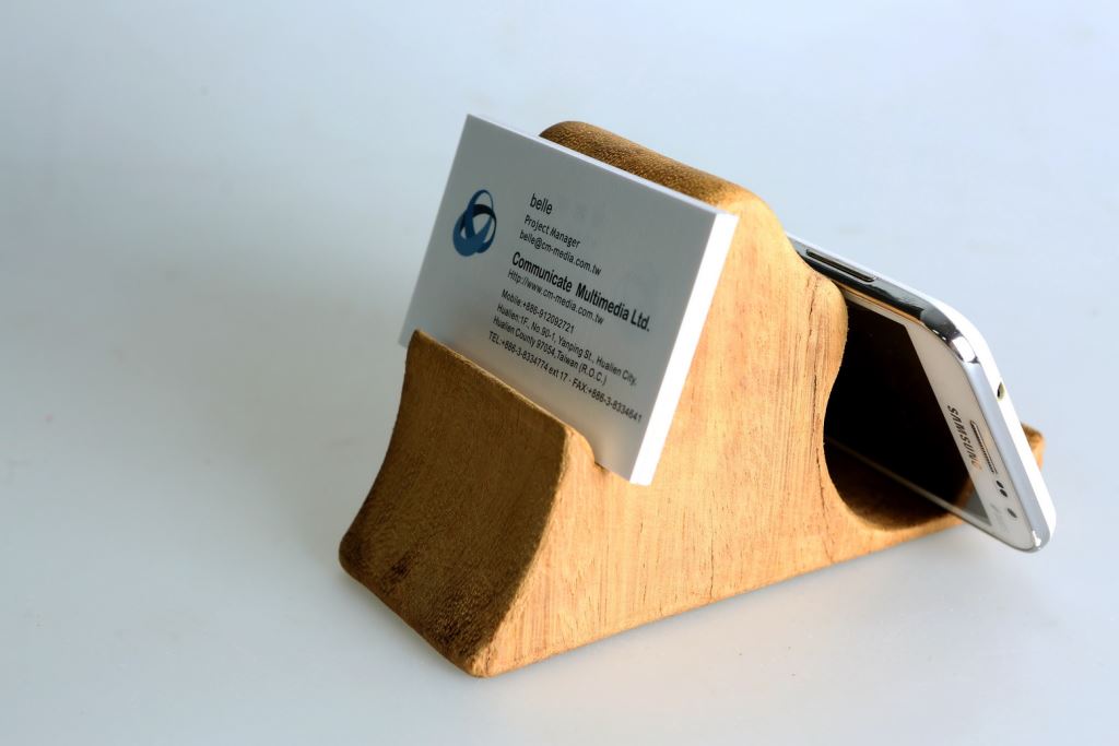 這件作品:利用木頭的原型做出一個小型的名片手機座,一邊是名片座,另一邊就化身為手機座,不管是直的放還是橫著放置手機,都相當的方便!
