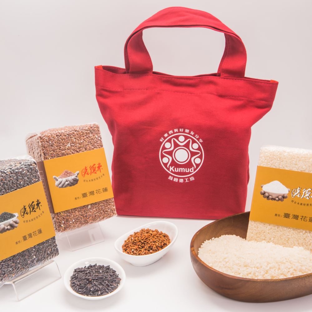 茉莉香米、紅米、黑米,三種珍貴米種組合,送禮大方又精美,艷紅的提袋增添喜氣。