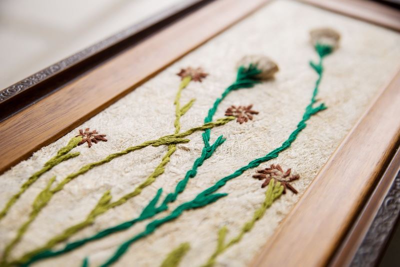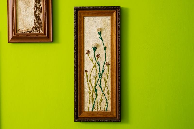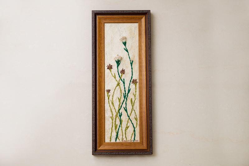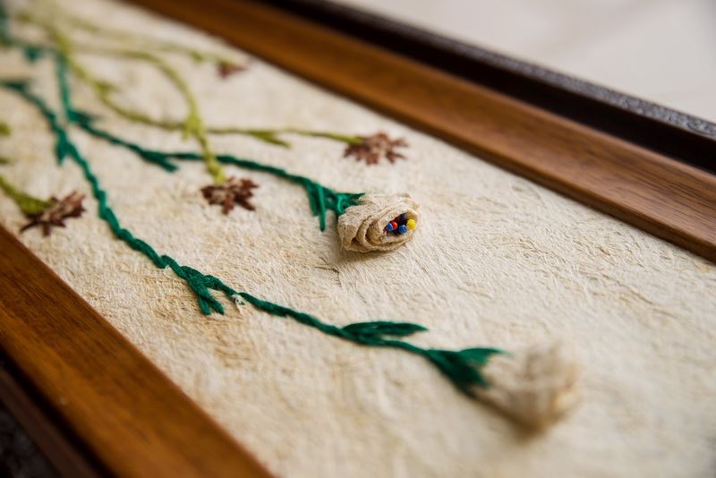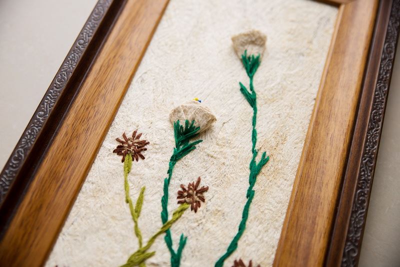 利用樹皮中天然的斑紋,結合毛線,栩栩如生的樹與花景,完整呈現,看著心中覺得放鬆,摸著樹皮的質感,如同真的直接摸著大樹一般,整幅掛畫全採用樹皮創作而成,把大自然帶回家。