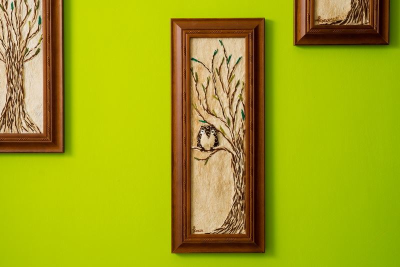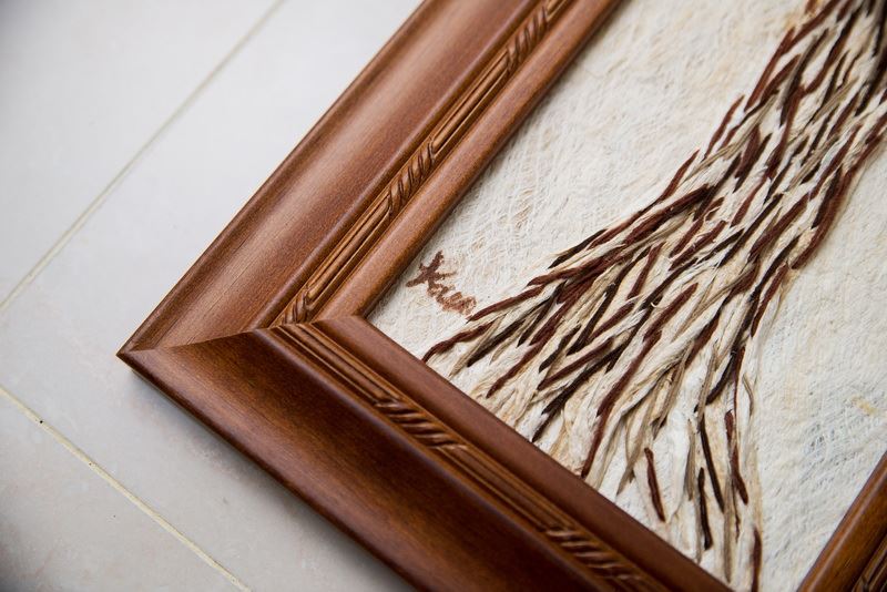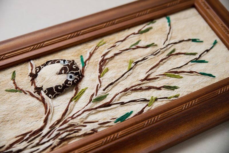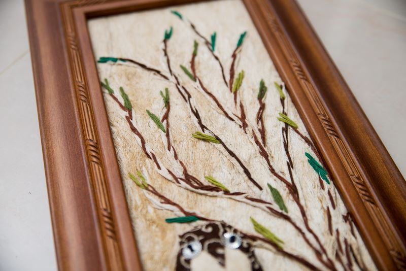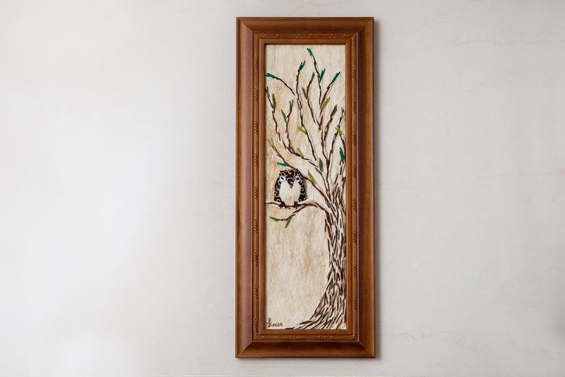 使用樹皮傳達意境,畫中的貓頭鷹,如同準備要帶給人們好運一般地留在枝梢上,整幅掛畫全採用樹皮創作而成,把樹帶入家中,自然又不失精美。