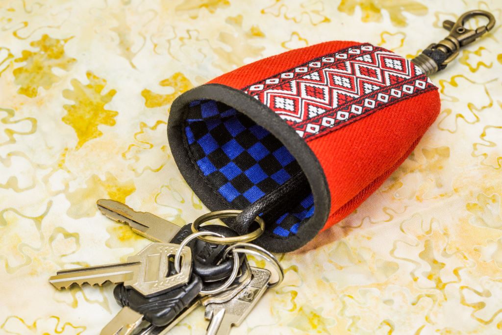 紅色的鑰匙包,是阿美族的紅白配色,圖騰象徵著祖靈之眼。