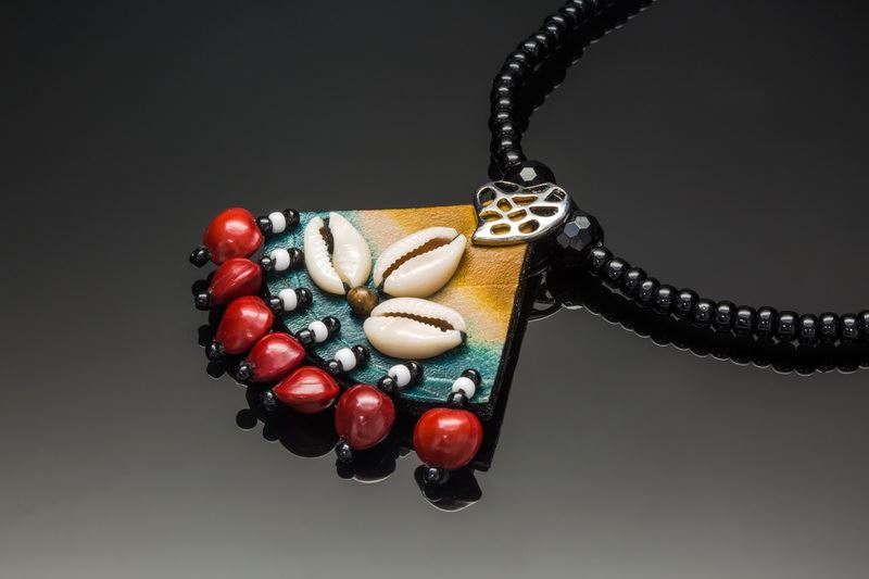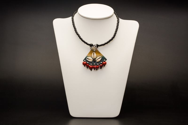 陳晏甄老師以純手工及天然素材,創作檳榔娃娃系列、情人袋、酒袋、無患子手鍊、皮雕項鍊、太陽福袋、海盜帽、樹皮檳榔娃娃吊飾系列、束口袋等,創作靈感都源自阿美族傳統服飾配件,加上新的創作思維,以貝類素材排成原民圖飾,配合些許金工與皮革元件,創作出精美的阿美族工藝品,是市場上難得一見的原住民工藝品佳作。