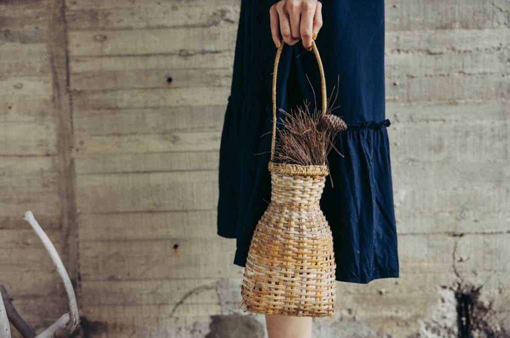 和傳統背籠一樣,魚簍依舊是全手工製作,別具特色的上窄下寬外型配上提把,