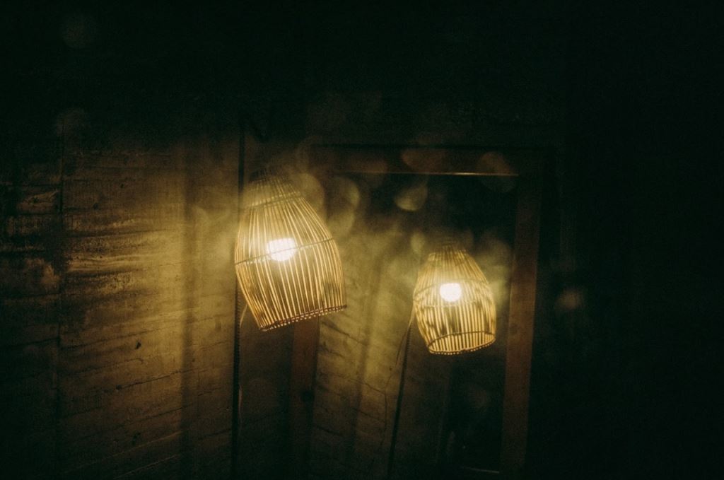 微弱的光線穿過黃藤間的縫隙,輝映在牆上形成光影,