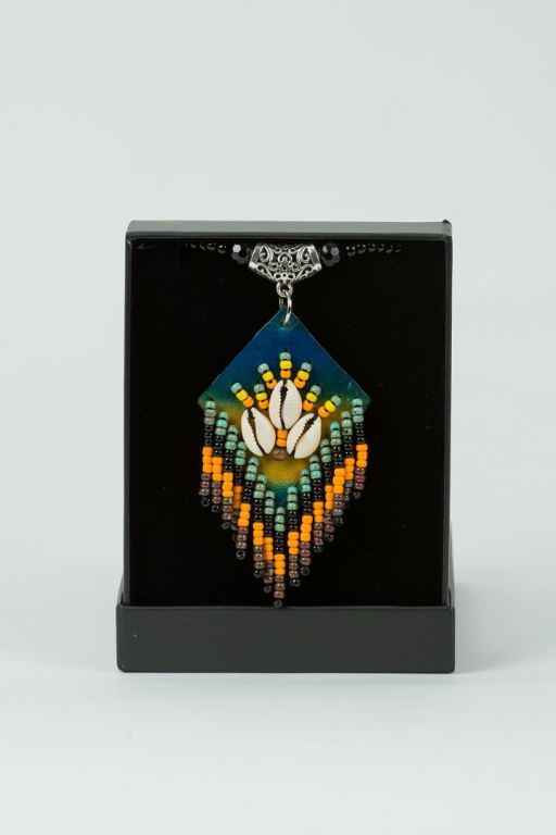 陳晏甄老師以純手工及天然素材,創作檳榔娃娃系列、情人袋、酒袋、無患子手鍊、皮雕項鍊、太陽福袋、海盜帽、樹皮檳榔娃娃吊飾系列、束口袋等,創作靈感都源自阿美族傳統服飾配件,加上新的創作思維,以貝類素材排成原民圖飾,配合些許金工與皮革元件,創作出精美的阿美族工藝品,是市場上難得一見的原住民工藝品佳作。