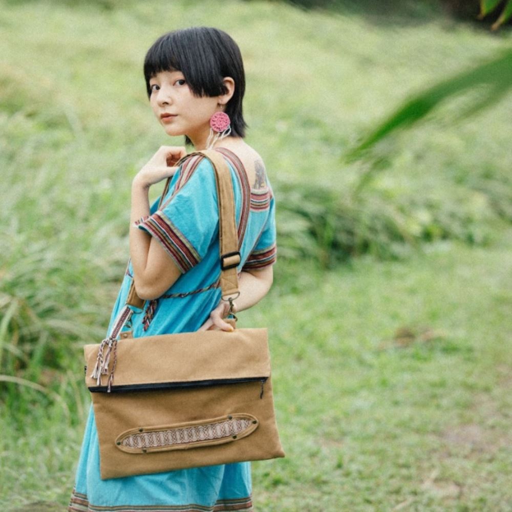 以手工編織太魯閣布匹作為裝飾,背帶可隨意取下,