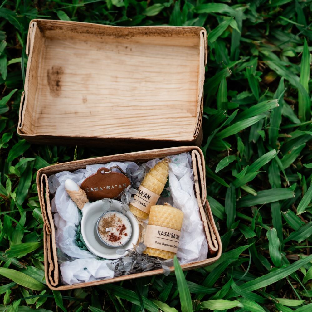 - 材質:台灣蜂蠟、大豆蠟蠟燭(檳榔、荖葉)、藤編燭台、台灣檳榔葉鞘盒(拿鞘)