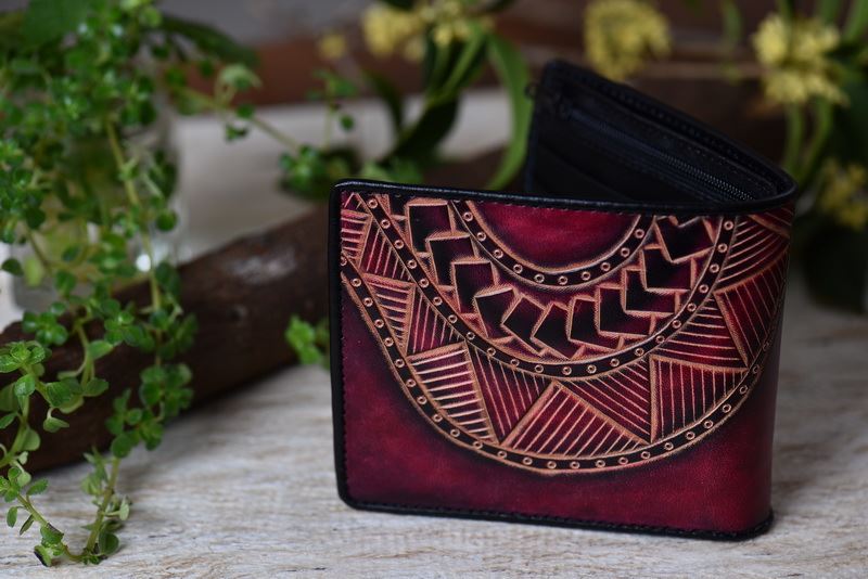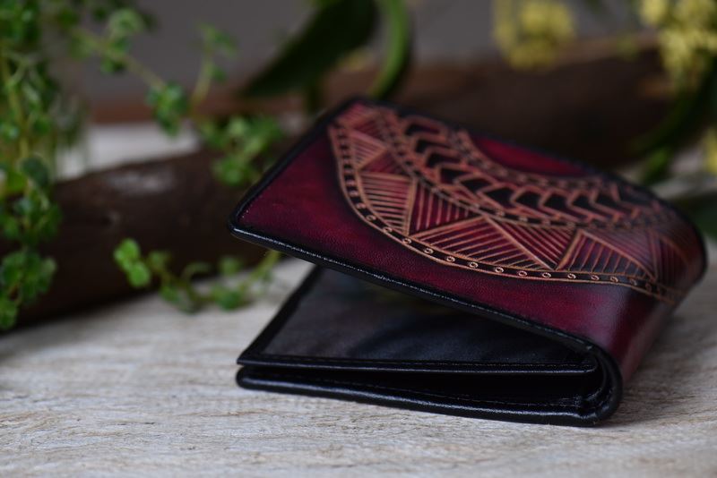 圖案設計全為百合老師與兒子自創的圖案雕法,線條自然,圖騰兼具奔放與細膩,使用物性上色法,讓牛皮上的每一色塊皆可達到完美漸層效果,清晰可見、色彩分明。