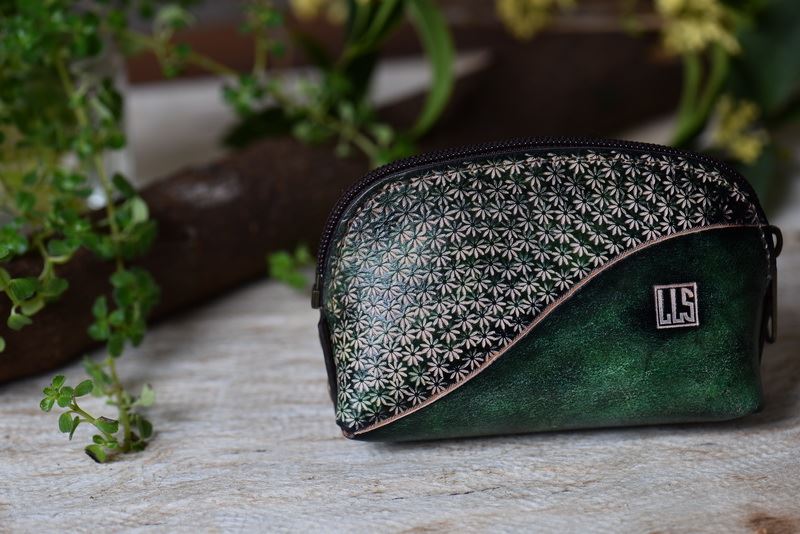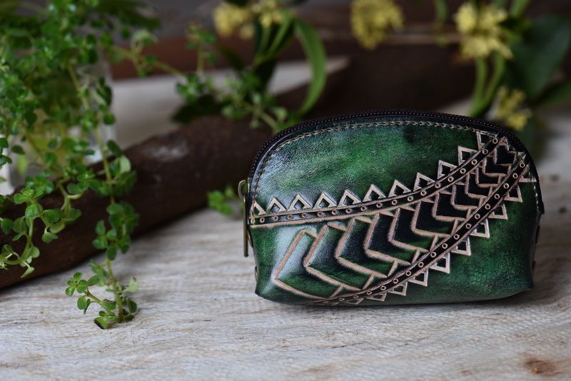 圖案設計全為百合老師與兒子自創的圖案雕法,線條自然,圖騰兼具奔放與細膩,使用物性上色法,讓牛皮上的每一色塊皆可達到完美漸層效果,清晰可見、色彩分明。