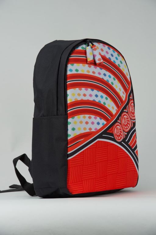 代表阿美族的山與海的線條、菱形標記代表祖靈以此圖紋找到我們,透過創作喚醒族人對過去生活記憶是最大的心願。