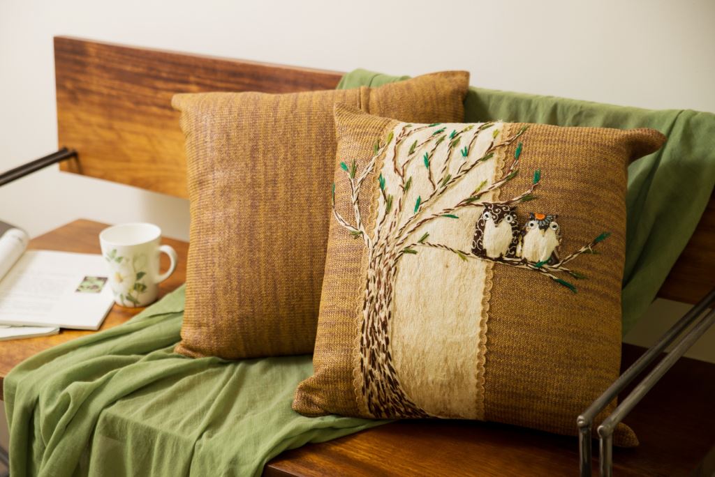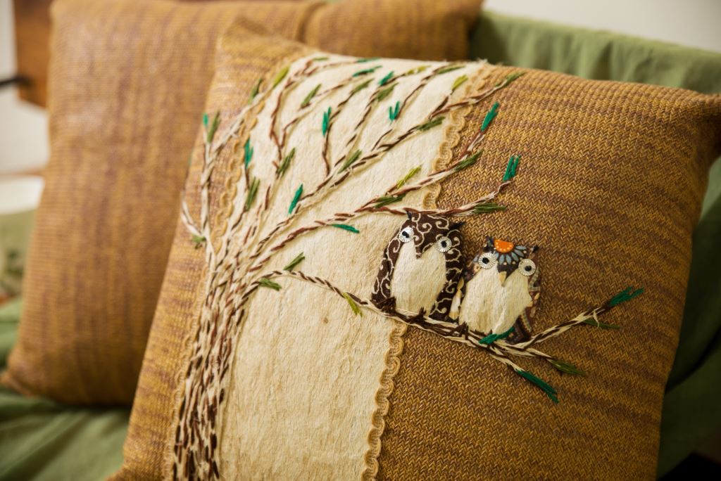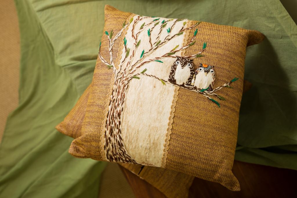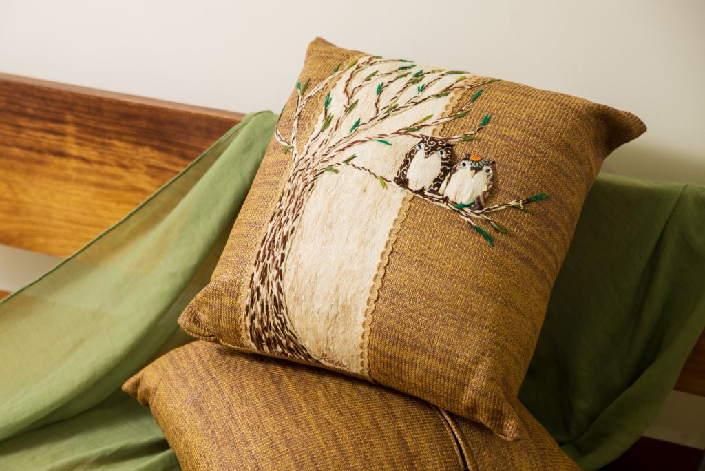 貓頭鷹如同準備要帶給人們好運一般地留在枝梢上,整顆抱枕採用樹皮創作而成,
