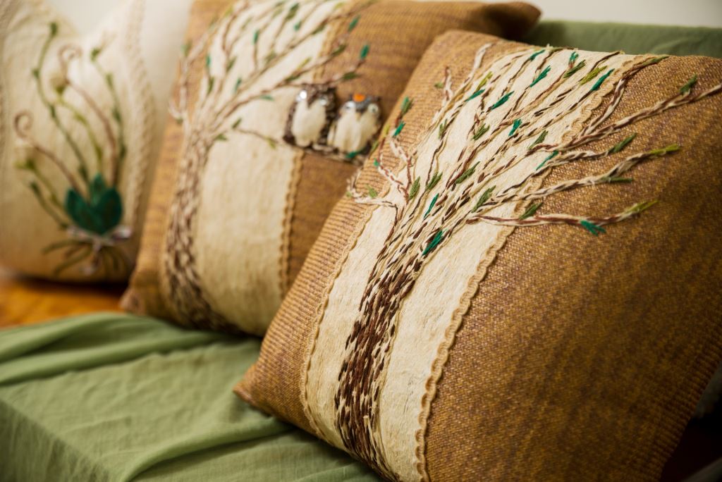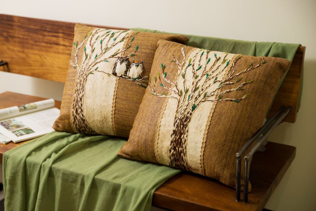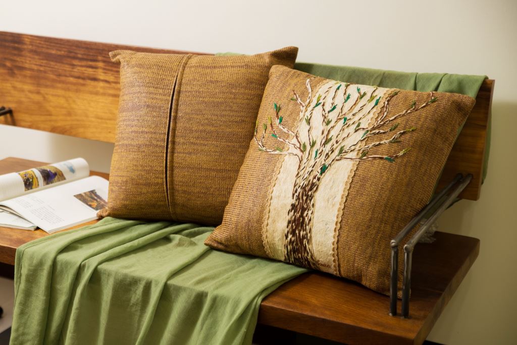 整顆抱枕採用樹皮創作而成,利用樹皮中天然的斑紋,結合毛線,