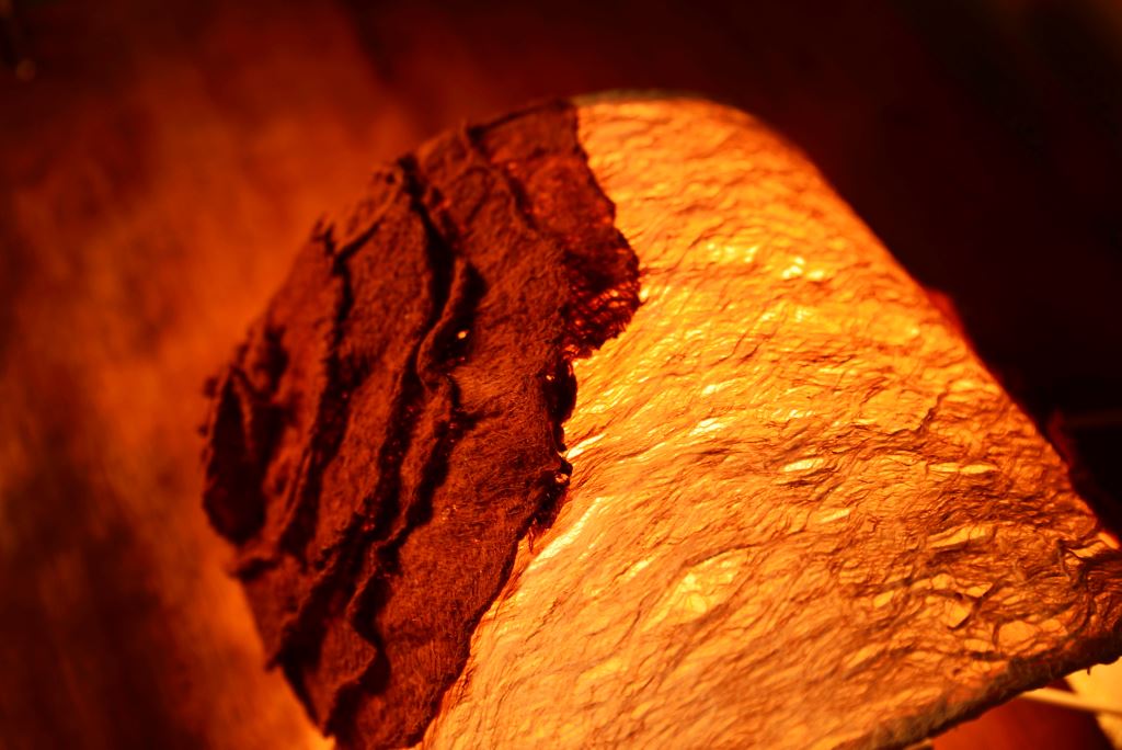 「槌」─ 將扒下來的的樹皮,用力搥打至薄片,由於搥打過程中,可能出現樹皮斷裂或破損,因此,力道的控制就格外重要。搥打後的樹皮,可延展為原來面積的四倍,紋理細膩美觀。