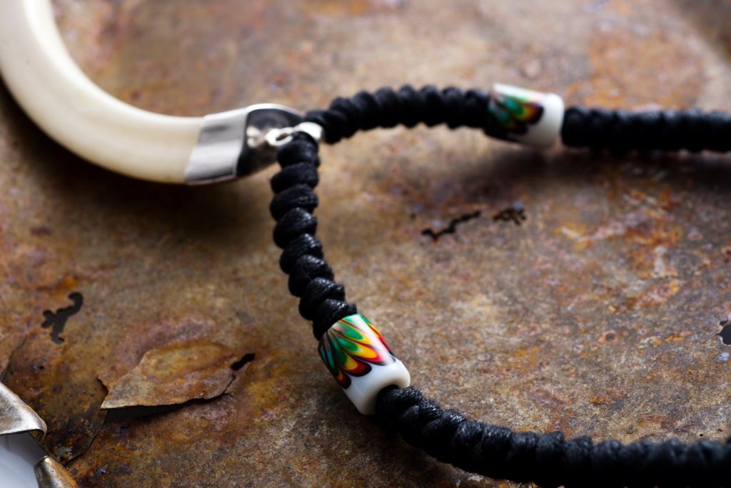 粗曠的黑繩子,搭配上琉璃飾物,讓山豬牙看起來更加率性