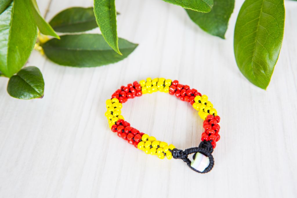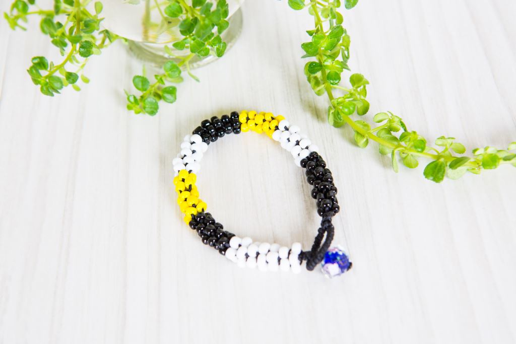 手工彩色串珠、田字編織技法。
