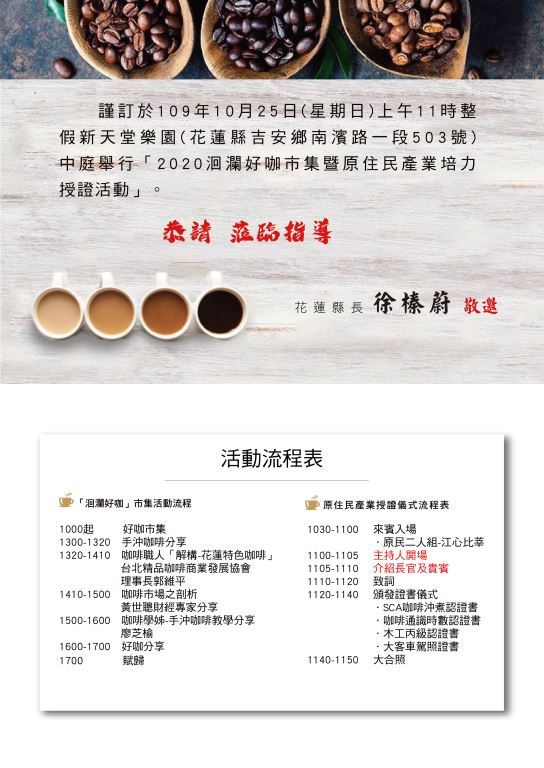 現場邀請財經專家黃世聰、台北精品咖啡商業發展協會理事長郭維平以及SCA咖啡講師兼考官的廖芝榆現身說法,更有小型木工傢俱策展,花蓮縣政府誠摯歡迎『咖啡愛好者』及『親朋好友』,一起來參加唷!