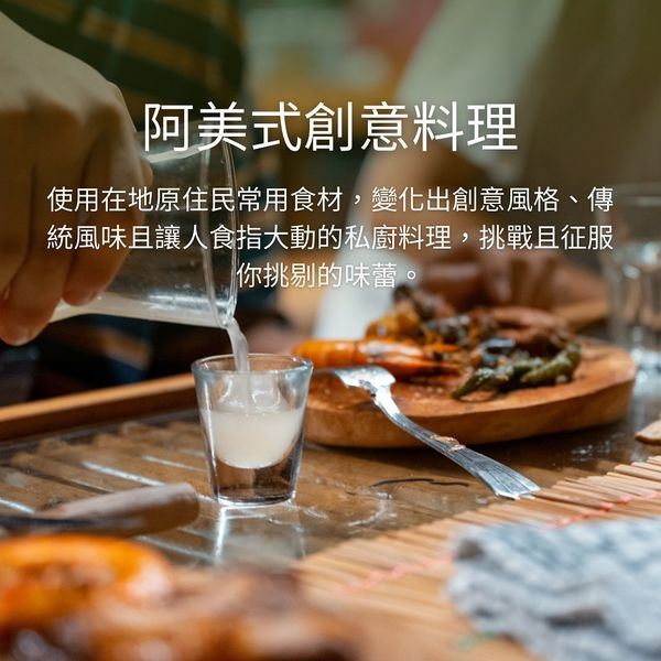 • 阿美式創意料理:在阿美族聖山「奇拉雅山」和廣大的太平洋,享受山林秘境的美景,享用部落青年廚師與部落媽媽攜手合作利用在地食材所打造的無菜單原民風味餐