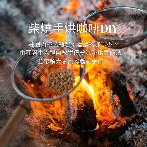 • 柴燒咖啡烘豆 DIY :由莊園主人親自教學傳統烘豆做法,最後也可以親自品嚐自己親手製做的咖啡