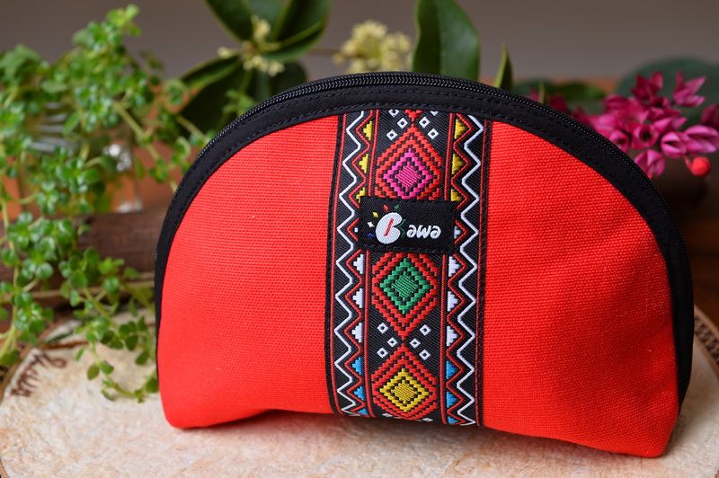 外觀半圓形、玫瑰紅中間襯著阿美族紋;內裡黑色。