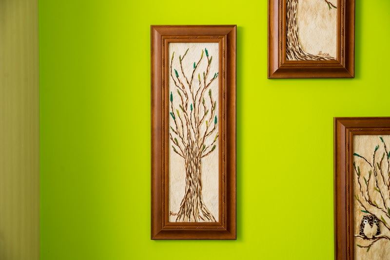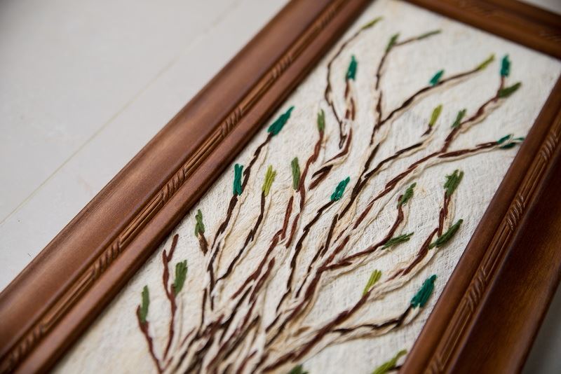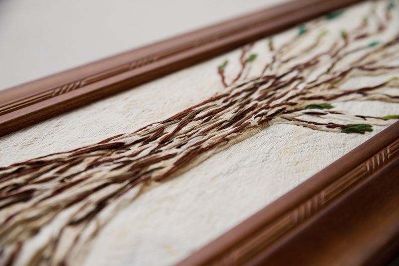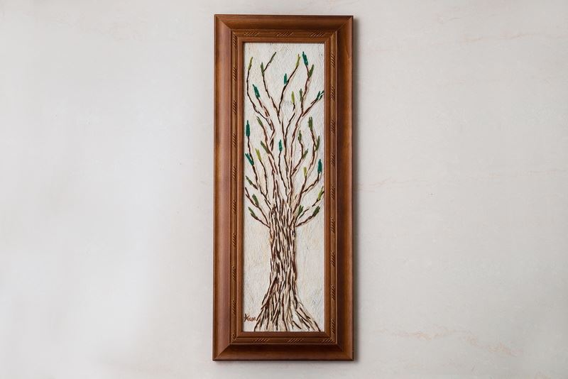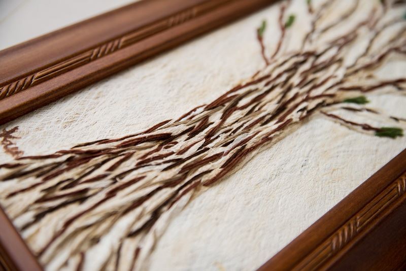利用樹皮中天然的斑紋,結合毛線,栩栩如生的樹與花景,完整呈現,看著心中覺得放鬆,摸著樹皮的質感,如同真的直接摸著大樹一般,整幅掛畫全採用樹皮創作而成,把大自然帶回家。
