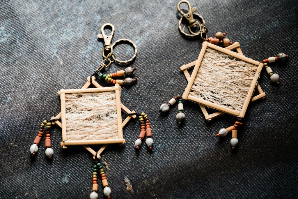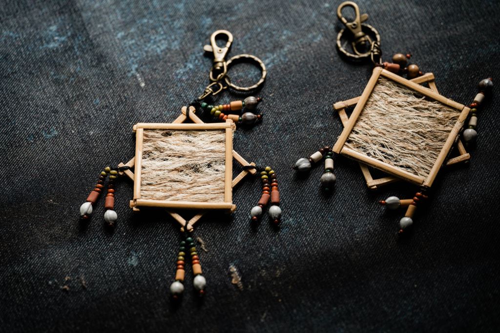 以檳榔葉鞘為面,最後加上太巴塱陶珠作點綴,