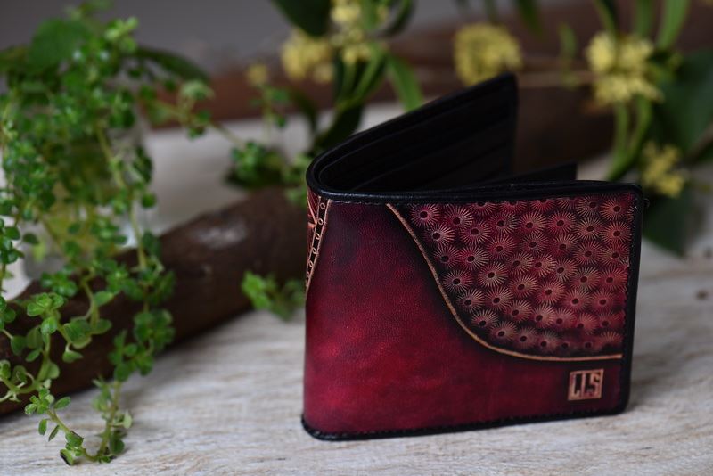 圖案設計全為百合老師與兒子自創的圖案雕法,線條自然,圖騰兼具奔放與細膩,使用物性上色法,讓牛皮上的每一色塊皆可達到完美漸層效果,清晰可見、色彩分明。