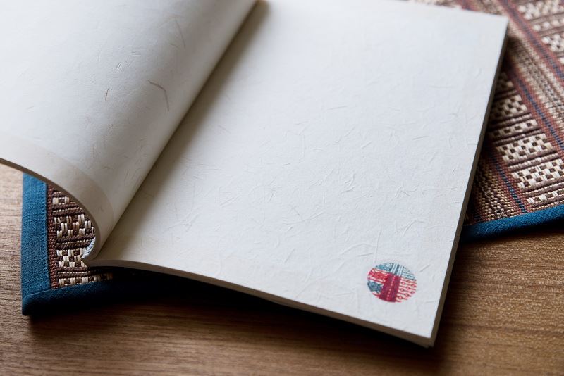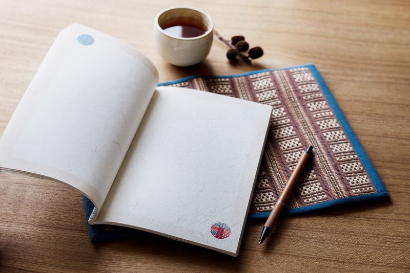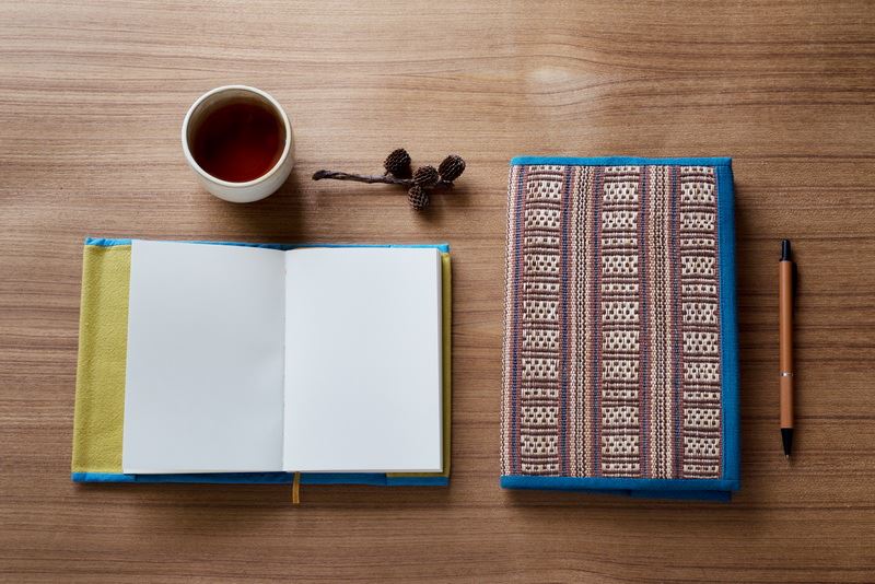 細密的香蕉絲布遇上綿布,觸感透氣舒適如同會呼吸的肌膚,常常觸摸會讓香蕉絲的色澤越來越光亮,如同隨著思緒的紀錄越發沉澱、透徹。工藝師們親手將植物染色後的香蕉絲,編織成時尚波浪紋,搭配大地色系棉布與淺色內裏,自然質樸中不失獨特個性魅力,觸感似草蓆卻不扎人皮膚,冬暖夏涼,貼心的香蕉絲,陪你/妳一起記錄時光。