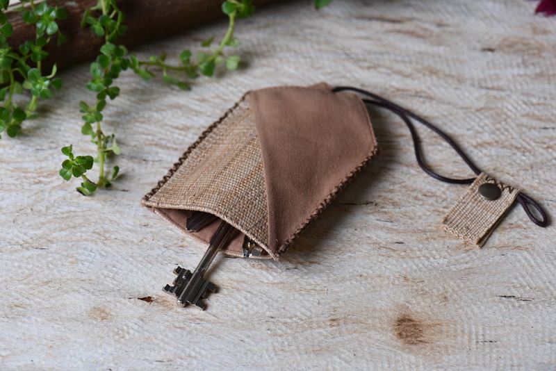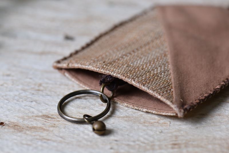 新社香蕉絲工坊發揮創意,按照米穀袋的原型設計出米穀鑰匙包,外型就像縮小的的米穀袋,細密的香蕉絲布接上帆布,耐髒不易磨損,常常觸摸香蕉絲會讓色澤越來越光亮。