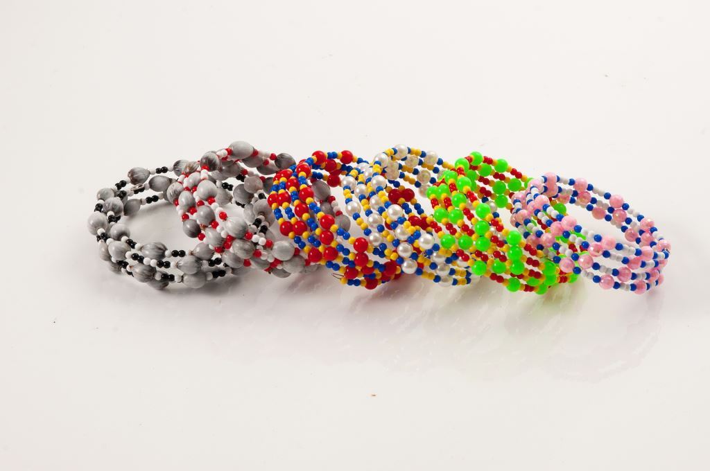 串珠的色彩亮麗多變,加上現代感的巧思,配合阿美族的傳統編織技法,豔麗的色彩系列,會讓人感受到熱烈的情緒,猶如聽到森巴音樂,就會聯想到嘉年華會,阿美族的傳統服飾習慣配戴大量的彩珠,配合精美的串珠工藝,在傳統服飾中,更可以發揮畫龍點睛的作用。